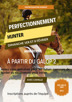 Venez vous entraîner pour les futurs concours de hunter ou simplement vous initier. Perfectionnement proposé par Camille les dimanches 1er et 8 février de 14h à 16h. Inscriptions auprès de l'équipe du centre équestre.